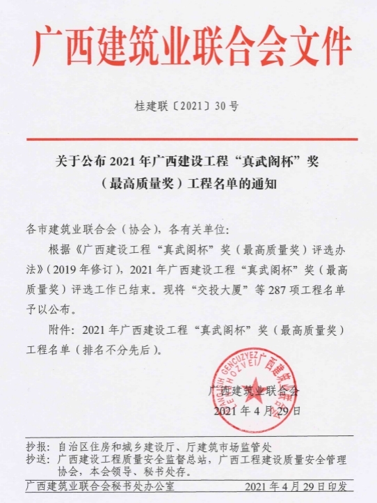 近日,廣西建筑業(yè)聯(lián)合會(huì)公布了2021年廣西建設(shè)工程“真武閣杯”獎(jiǎng)(最高質(zhì)量獎(jiǎng))入選工程名單,由我公司負(fù)責(zé)監(jiān)理的8個(gè)項(xiàng)目脫穎而出,同時(shí)獲獎(jiǎng)!再一次有力印證了公司在工程咨詢行業(yè)的強(qiáng)大實(shí)力。