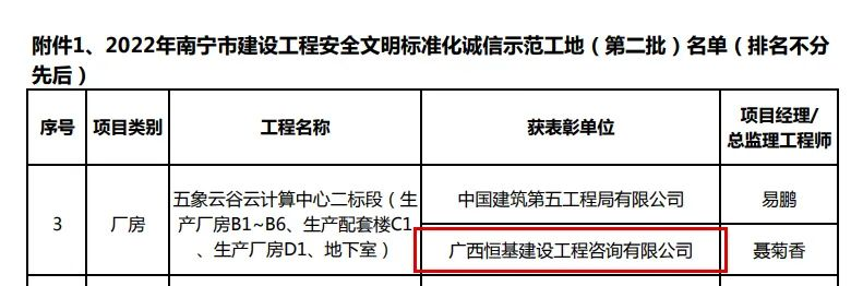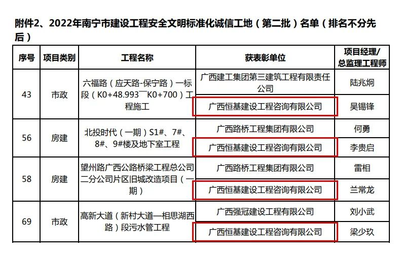▲2022年南寧市建設(shè)工程安全文明標(biāo)準(zhǔn)化誠(chéng)信示范工地(第二批)獲獎(jiǎng)名單