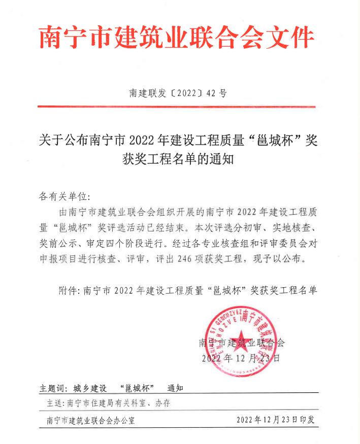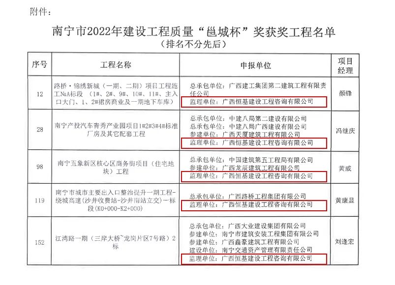 近日,南寧市建筑業(yè)聯(lián)合會公布了2022年建設(shè)工程質(zhì)量“邕城杯”獎獲獎工程名單,由廣西恒基建設(shè)工程咨詢有限公司擔(dān)任監(jiān)理單位的5個項(xiàng)目斬獲此殊榮。