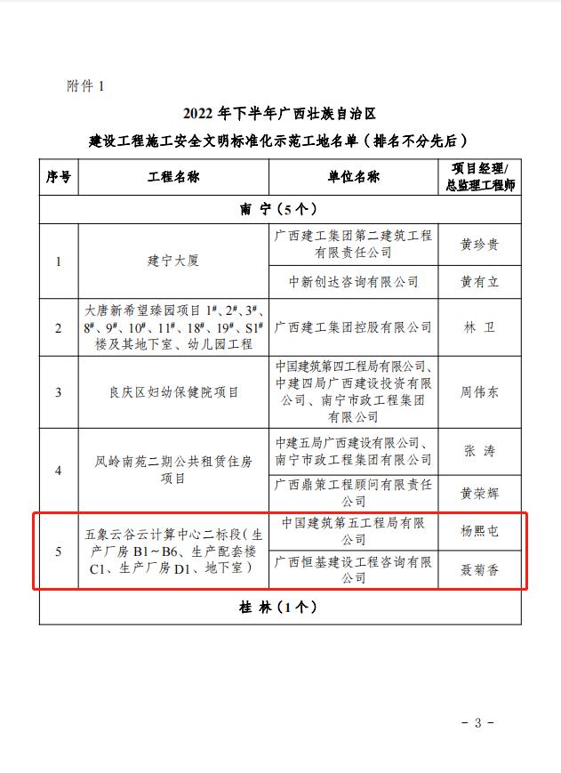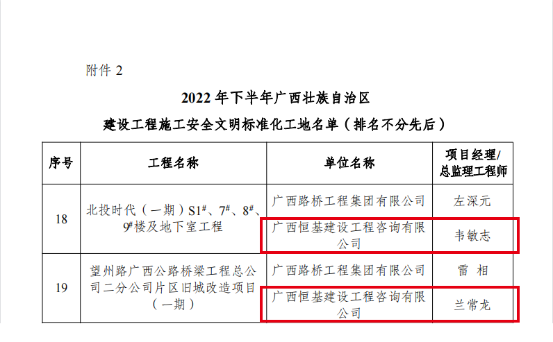 1月17日,廣西工程建設(shè)質(zhì)量安全管理協(xié)會公布了2022年下半年廣西建設(shè)工程施工安全文明標準化示范工地及2022年下半年廣西建設(shè)工程施工安全文明標準化工地名單,恒基咨詢1個項目榮獲2022年下半年廣西建設(shè)工程施工安全文明標準化示范工地,2個項目榮獲2022年下半年廣西建設(shè)工程施工安全文明標準化工地。