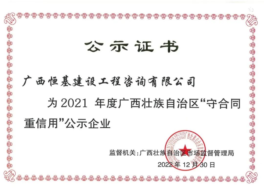 近日,廣西壯族自治區(qū)市場監(jiān)督管理局發(fā)布了《關于公示廣西2021年度“守合同 重信用”企業(yè)名單的通告》。恒基咨詢憑借良好的市場信譽和優(yōu)質的合同履約能力,榮獲2021年度廣西“守合同重信用”企業(yè)稱號。