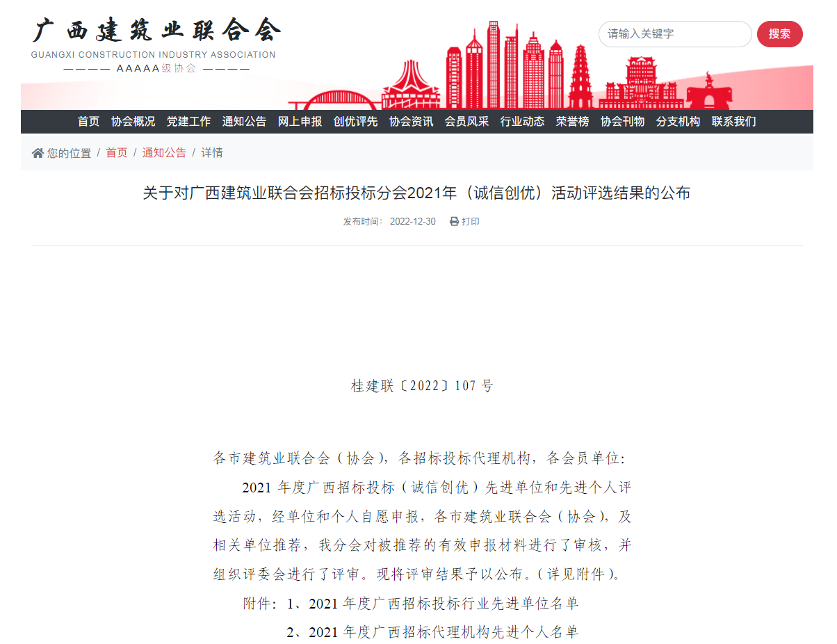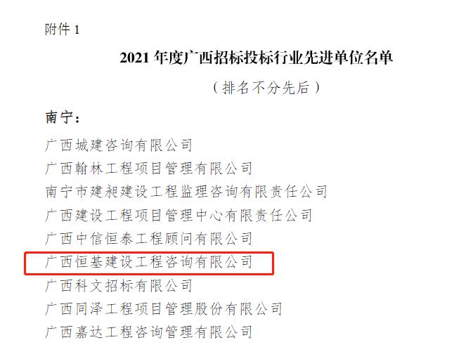 3月15日,廣西建筑業(yè)聯(lián)合會(huì)召開(kāi)招標(biāo)投標(biāo)分會(huì)二屆四次會(huì)員代表大會(huì),會(huì)上表彰了2021年度廣西招標(biāo)投標(biāo)行業(yè)先進(jìn)單位以及2021年度廣西招標(biāo)代理機(jī)構(gòu)先進(jìn)個(gè)人。廣西恒基建設(shè)工程咨詢有限公司在眾多參評(píng)單位中脫穎而出,榮獲“2021年度廣西招標(biāo)投標(biāo)行業(yè)先進(jìn)單位”;同時(shí),公司石愛(ài)娟、周赤衛(wèi)、覃漢東、劉世健、陸秒、任坤、黃俊才、方興8人獲評(píng)“2021年度廣西招標(biāo)代理機(jī)構(gòu)先進(jìn)個(gè)人”稱號(hào)。