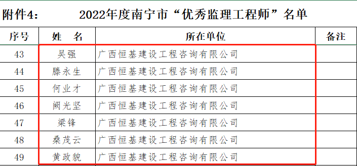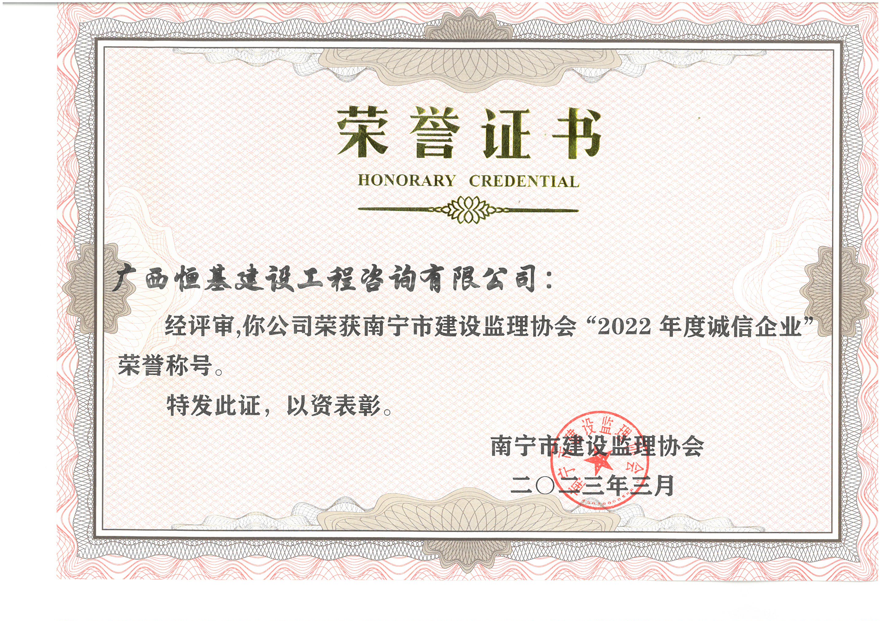 衡量一家企業(yè)綜合實(shí)力的重要指標(biāo),它是基于評估對象的信用紀(jì)錄、履約能力、經(jīng)營狀況、綜合實(shí)力與競爭力等多項(xiàng)指標(biāo)的科學(xué)評估與認(rèn)證。獲評“2022年度誠信企業(yè)”及2022年度南寧市“先進(jìn)監(jiān)理單位”這一殊榮,是誠信經(jīng)營累計(jì)的集中體現(xiàn),標(biāo)志著恒基咨詢在行業(yè)內(nèi)的企業(yè)信用、項(xiàng)目管理能力、社會(huì)責(zé)任等方面均得到監(jiān)理行業(yè)的充分認(rèn)可。2022年度"先進(jìn)監(jiān)理單位"此外,本次公布的年度評選優(yōu)秀個(gè)人名單中我司共14人獲評“優(yōu)秀總監(jiān)理工程師”和“優(yōu)秀監(jiān)理工程師”。榮譽(yù)既是對我司項(xiàng)目管理服務(wù)和監(jiān)理人員工作成績的肯定,也是對企業(yè)推動(dòng)行業(yè)示范效應(yīng)和杰出人才培養(yǎng)的激勵(lì)。2022年度"優(yōu)秀總監(jiān)理工程師"2022年度"優(yōu)秀監(jiān)理工程師"本次評定體現(xiàn)了公司在監(jiān)理行業(yè)中堅(jiān)持誠信守法經(jīng)營、切實(shí)履行社會(huì)責(zé)任的肯定,對提高公司知名度、拓寬經(jīng)營領(lǐng)域、提升競爭優(yōu)勢等起到積極推動(dòng)作用,也將進(jìn)一步激勵(lì)公司為行業(yè)高質(zhì)量發(fā)展作出新的貢獻(xiàn)。