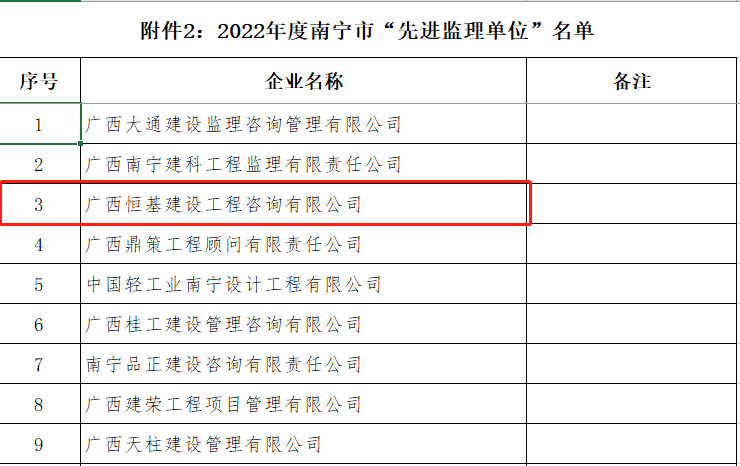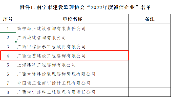 近日,南寧市建設(shè)監(jiān)理協(xié)會(huì)公布了2022年度優(yōu)秀監(jiān)理單位及優(yōu)秀個(gè)人表彰名單,我司連續(xù)多年獲評 “2022年度誠信企業(yè)”及2022年度南寧市“先進(jìn)監(jiān)理單位”榮譽(yù)稱號。