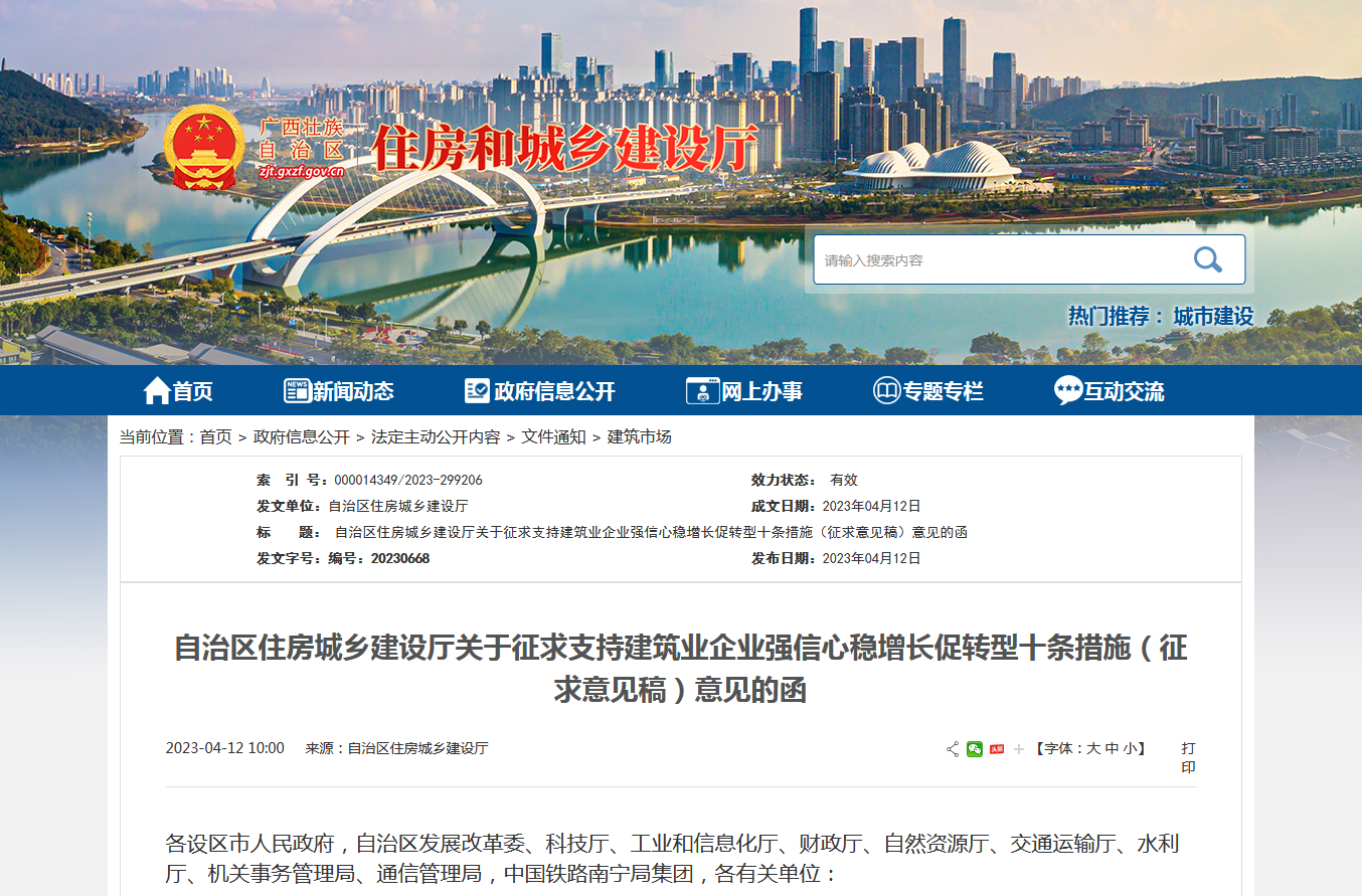 為全面貫徹黨的二十大精神,深入落實(shí)中央、全區(qū)經(jīng)濟(jì)工作會(huì)議部署要求,推進(jìn)政策加力助力全區(qū)經(jīng)濟(jì)整體好轉(zhuǎn),積極幫助我區(qū)建筑業(yè)企業(yè)增強(qiáng)發(fā)展信心,持續(xù)推動(dòng)全區(qū)建筑業(yè)高質(zhì)量發(fā)展,我廳起草了《關(guān)于支持建筑業(yè)企業(yè)強(qiáng)信心穩(wěn)增長(zhǎng)促轉(zhuǎn)型十條措施》(征求意見稿),現(xiàn)印發(fā)給你們征求意見。請(qǐng)各單位認(rèn)真研究,于2023年4月27日前將修改意見和建議(含電子文檔)反饋我廳,逾期未反饋意見視為無(wú)意見。