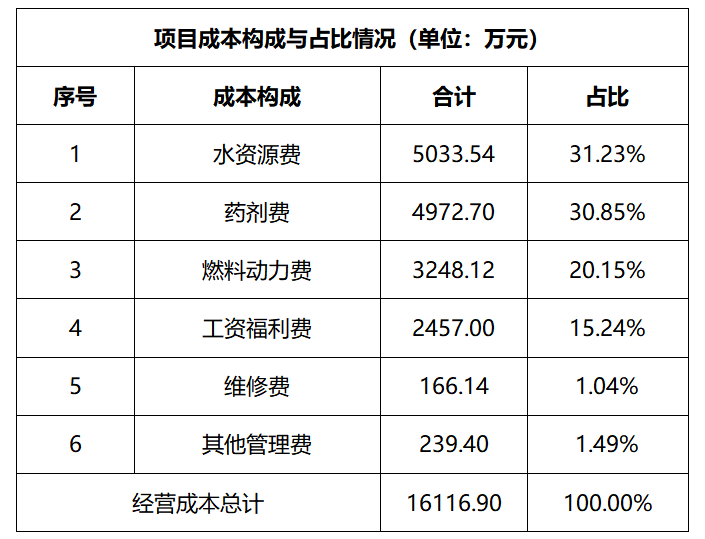 本項(xiàng)目經(jīng)營(yíng)成本主要包括水資源費(fèi)、藥劑費(fèi)、燃料動(dòng)力、工資福利費(fèi)、修理費(fèi)、其他管理費(fèi)用。