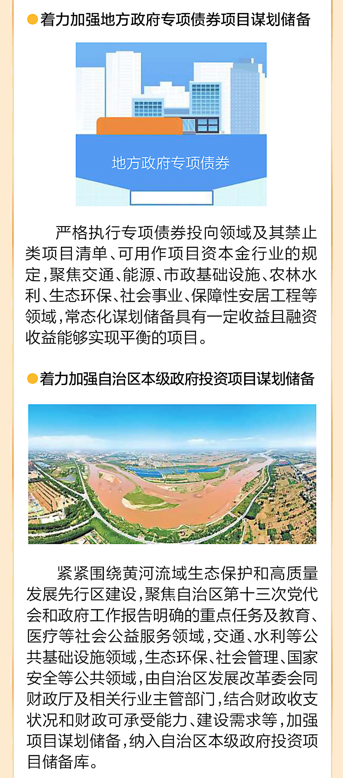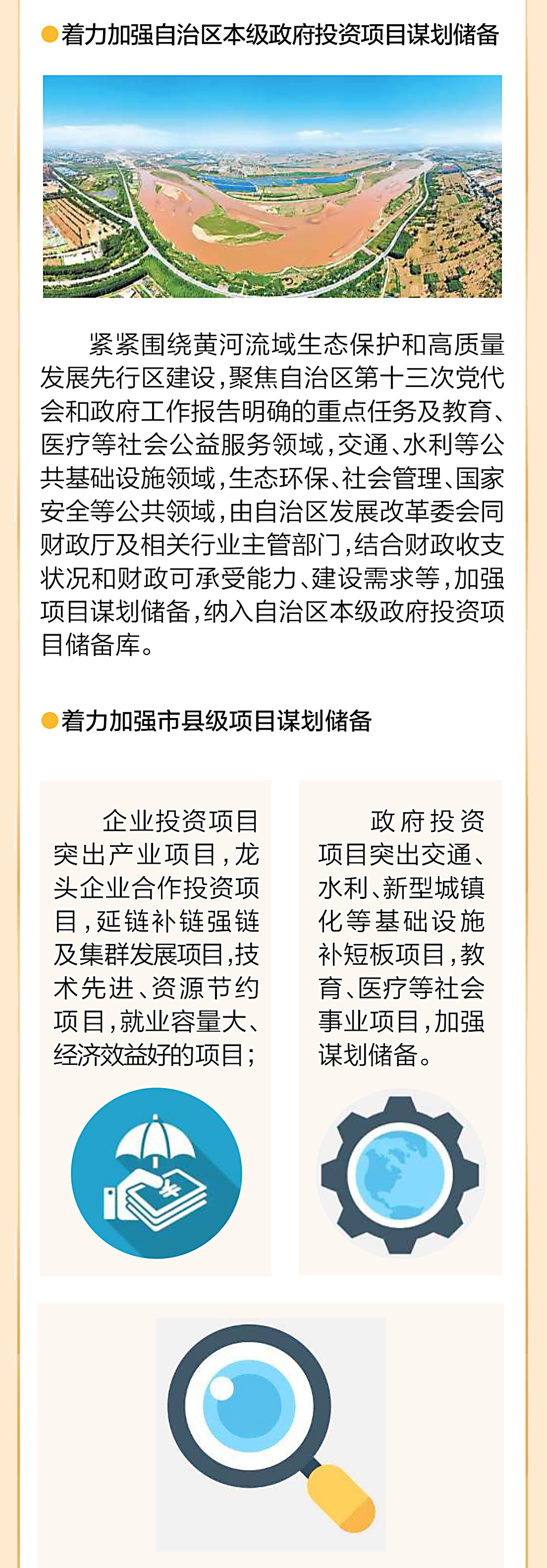 (三)著力加強(qiáng)自治區(qū)本級(jí)政府投資項(xiàng)目謀劃儲(chǔ)備。緊緊圍繞黃河流域生態(tài)保護(hù)和高質(zhì)量發(fā)展先行區(qū)建設(shè),聚焦自治區(qū)第十三次黨代會(huì)和政府工作報(bào)告明確的重點(diǎn)任務(wù)及教育、醫(yī)療等社會(huì)公益服務(wù)領(lǐng)域,交通、水利等公共基礎(chǔ)設(shè)施領(lǐng)域,生態(tài)環(huán)保、社會(huì)管理、國(guó)家安全等公共領(lǐng)域,由自治區(qū)發(fā)展改革委會(huì)同財(cái)政廳及相關(guān)行業(yè)主管部門,結(jié)合財(cái)政收支狀況和財(cái)政可承受能力、建設(shè)需求等,加強(qiáng)項(xiàng)目謀劃儲(chǔ)備,納入自治區(qū)本級(jí)政府投資項(xiàng)目?jī)?chǔ)備庫(kù)。對(duì)納入儲(chǔ)備庫(kù)的項(xiàng)目按照“突出重點(diǎn)、先急后緩、有保有壓”原則,由自治區(qū)發(fā)展改革委列入年度自治區(qū)預(yù)算內(nèi)統(tǒng)籌投資建議計(jì)劃,建議計(jì)劃報(bào)自治區(qū)人民政府分管發(fā)展改革部門的領(lǐng)導(dǎo)審核后,提請(qǐng)自治區(qū)人民政府常務(wù)會(huì)議審定。