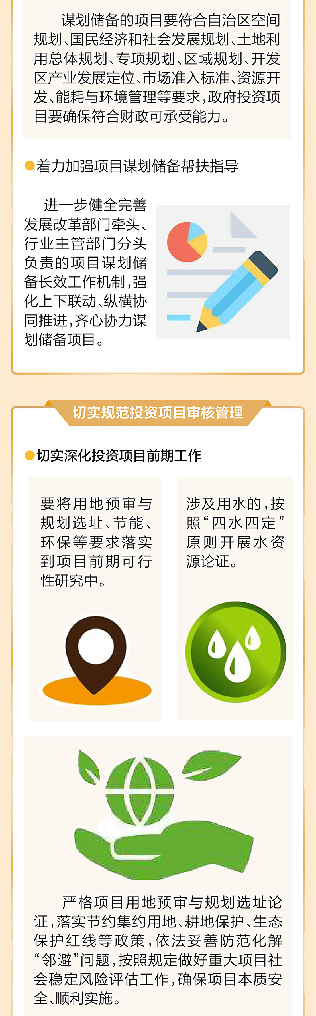 (四)著力加強(qiáng)市縣級(jí)項(xiàng)目謀劃儲(chǔ)備。根據(jù)國(guó)家和自治區(qū)國(guó)民經(jīng)濟(jì)和社會(huì)發(fā)展規(guī)劃綱要明確的重大工程項(xiàng)目和各專項(xiàng)規(guī)劃等,緊盯國(guó)家重大戰(zhàn)略和投資導(dǎo)向,按照有利于補(bǔ)齊短板、增加供給、滿足需求、優(yōu)化結(jié)構(gòu)、改善民生、保護(hù)生態(tài)的原則,企業(yè)投資項(xiàng)目突出產(chǎn)業(yè)項(xiàng)目,龍頭企業(yè)合作投資項(xiàng)目,延鏈補(bǔ)鏈強(qiáng)鏈及集群發(fā)展項(xiàng)目,技術(shù)先進(jìn)、資源節(jié)約項(xiàng)目,就業(yè)容量大、經(jīng)濟(jì)效益好的項(xiàng)目;政府投資項(xiàng)目突出交通、水利、新型城鎮(zhèn)化等基礎(chǔ)設(shè)施補(bǔ)短板項(xiàng)目,教育、醫(yī)療等社會(huì)事業(yè)項(xiàng)目,加強(qiáng)謀劃儲(chǔ)備。謀劃儲(chǔ)備的項(xiàng)目要符合自治區(qū)空間規(guī)劃、國(guó)民經(jīng)濟(jì)和社會(huì)發(fā)展規(guī)劃、土地利用總體規(guī)劃、專項(xiàng)規(guī)劃、區(qū)域規(guī)劃、開發(fā)區(qū)產(chǎn)業(yè)發(fā)展定位、市場(chǎng)準(zhǔn)入標(biāo)準(zhǔn)、資源開發(fā)、能耗與環(huán)境管理等要求,政府投資項(xiàng)目要確保符合財(cái)政可承受能力。