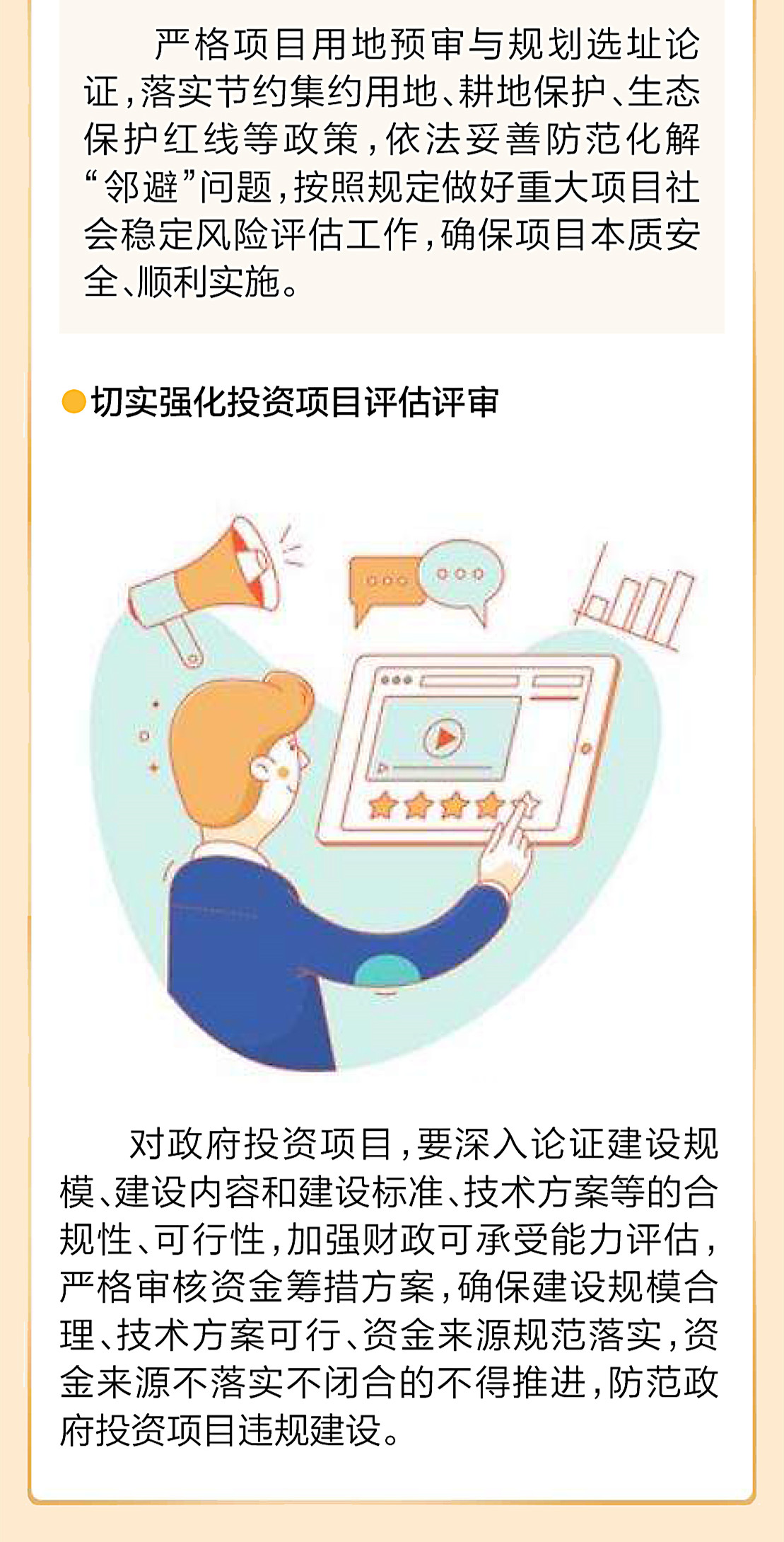 (二)切實(shí)強(qiáng)化投資項(xiàng)目評(píng)估評(píng)審。對(duì)政府投資項(xiàng)目,要深入論證建設(shè)規(guī)模、建設(shè)內(nèi)容和建設(shè)標(biāo)準(zhǔn)、技術(shù)方案等的合規(guī)性、可行性,加強(qiáng)財(cái)政可承受能力評(píng)估,嚴(yán)格審核資金籌措方案,確保建設(shè)規(guī)模合理、技術(shù)方案可行、資金來(lái)源規(guī)范落實(shí),資金來(lái)源不落實(shí)不閉合的不得推進(jìn),防范政府投資項(xiàng)目違規(guī)建設(shè)。涉及舉債融資的項(xiàng)目,要將融資方案作為可行性研究論證重點(diǎn),堅(jiān)決防止新增政府隱性債務(wù)。對(duì)企業(yè)投資項(xiàng)目,要重點(diǎn)審查是否符合發(fā)展規(guī)劃、產(chǎn)業(yè)政策、準(zhǔn)入標(biāo)準(zhǔn)、用地政策、環(huán)保政策、用能政策等,確保項(xiàng)目依法合規(guī)實(shí)施。對(duì)高耗能、高排放項(xiàng)目,要深入論證建設(shè)的必要性、可行性,堅(jiān)決遏制“兩高”項(xiàng)目盲目發(fā)展、違規(guī)上馬。