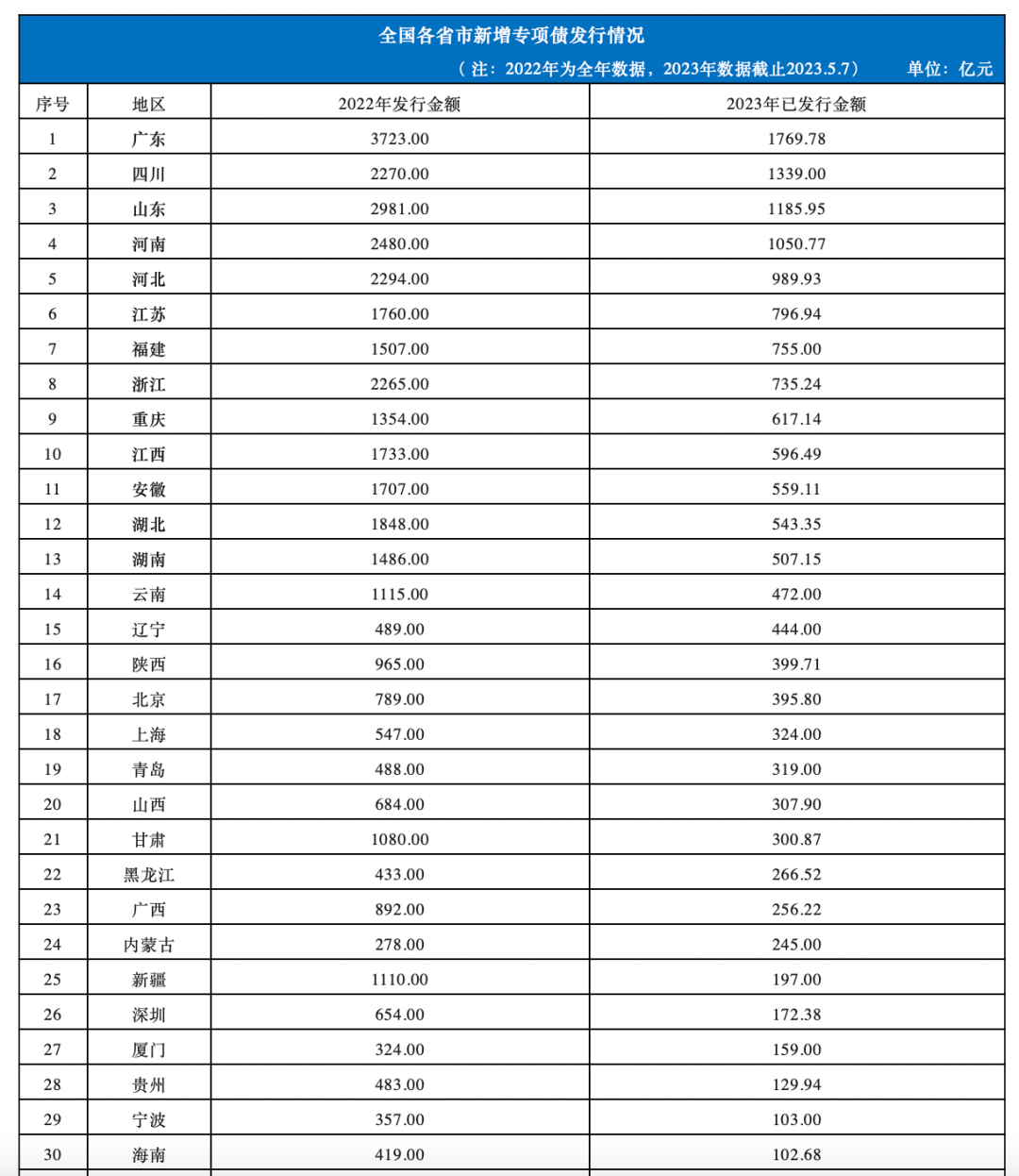 從去年全年地方政府新增專項(xiàng)債券發(fā)行規(guī)模來看,2022年廣東、山東、河南、河北、四川、浙江等省份新增專項(xiàng)債發(fā)行規(guī)模超2000億元。其中,廣東3723億元、山東2981億元、河南2480億元、河北2294億元、四川2270億元、浙江2265億元。此外,發(fā)行規(guī)模超1300億元的省份有7個(gè),分別是湖北1848億元、江蘇1760億元、江西1733億元、安徽1707億元、福建1507億元、湖南1486億元、重慶1354億元。