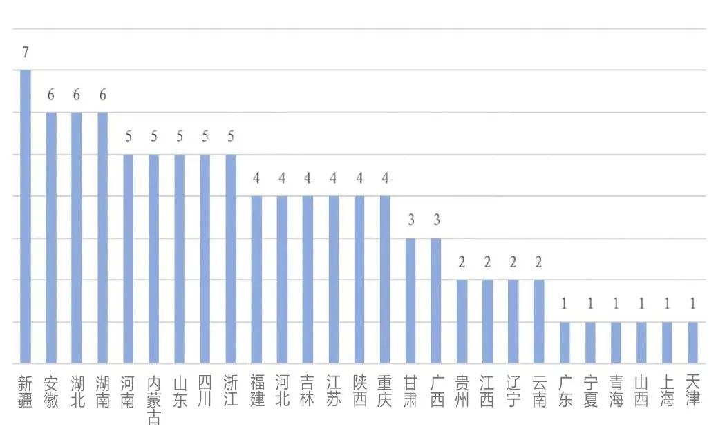 從地區(qū)分布看,27個省/直轄市申報了試點項目,其中,華東地區(qū)試點項目數(shù)量最多,涉及27個項目,占比28.72%;西北地區(qū)涉及16個項目,占比17.02%;西南地區(qū)涉及13個項目,占比13.83%;華北和華中地區(qū)均涉及11個項目,占比11.7%;華南地區(qū)涉及10個項目,占比10.64%;最后是東北地區(qū),涉及6個項目,占比6.38%。具體各省/直轄市數(shù)量分布如圖1-1所示。