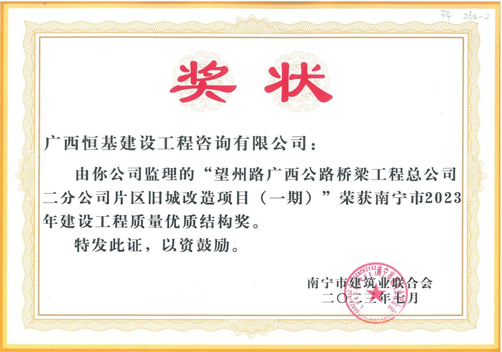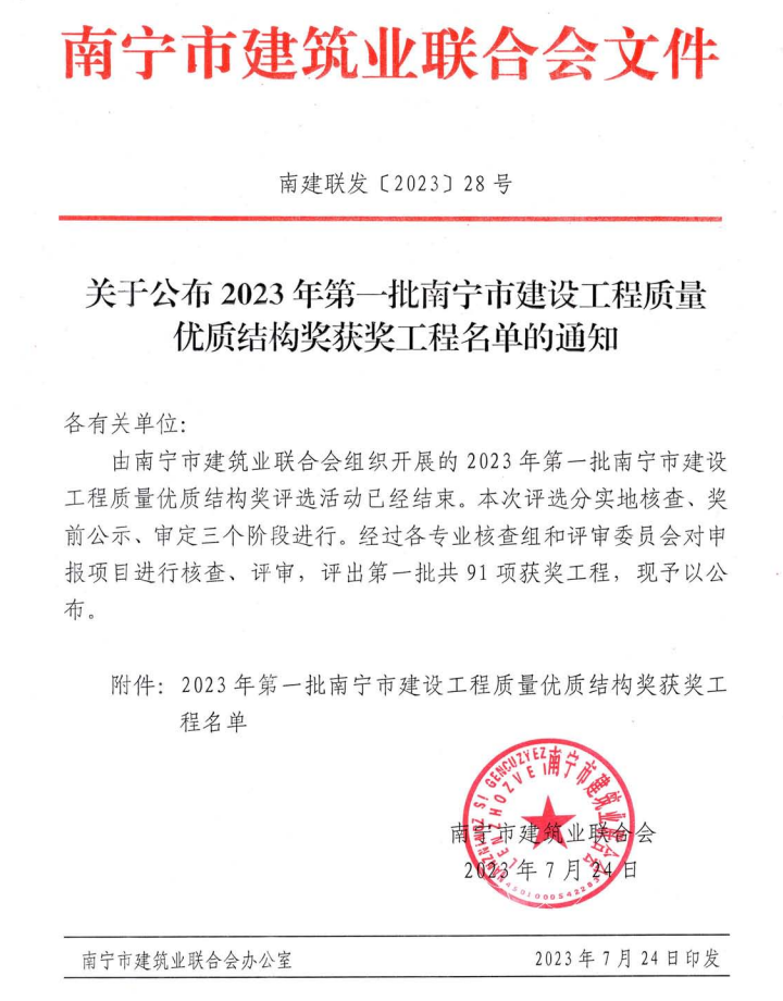 近日,南寧市建筑業(yè)聯(lián)合會(huì)公布2023年第一批南寧市建設(shè)工程質(zhì)量?jī)?yōu)質(zhì)結(jié)構(gòu)獎(jiǎng)獲獎(jiǎng)工程名單,我司望州路廣西公路橋梁工程總公司二分公司片區(qū)舊城改造項(xiàng)目(一期)項(xiàng)目獲獎(jiǎng)。