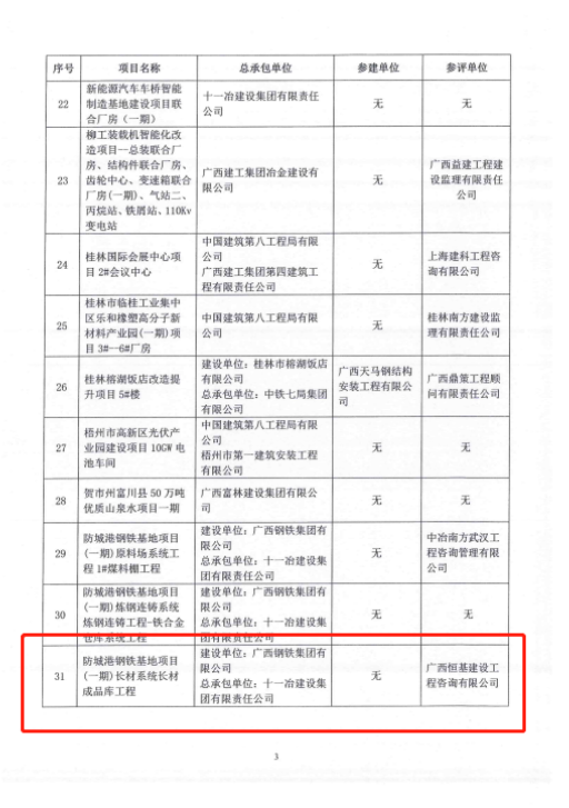近日,廣西建筑業(yè)聯(lián)合會公布2023年度廣西鋼結(jié)構(gòu)金獎工程名單,廣西恒基咨詢監(jiān)理的防城港鋼鐵基地項目(一期)長材系統(tǒng)長材成品庫工程位列其中。