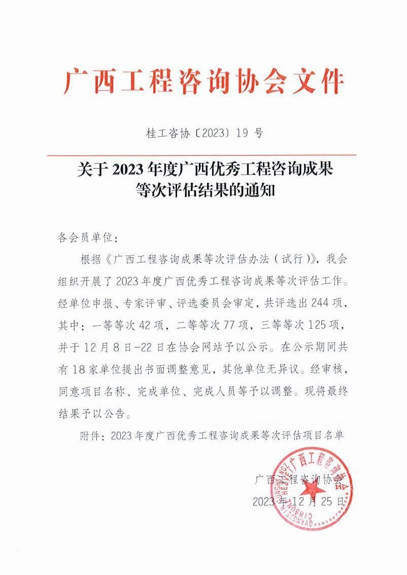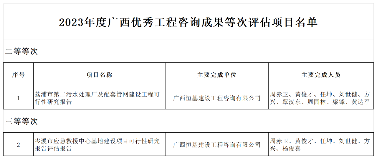 近日,廣西工程咨詢協(xié)會(huì)公布了2023年度廣西優(yōu)秀工程咨詢成果等次評(píng)估項(xiàng)目名單,恒基咨詢報(bào)送的兩項(xiàng)工程咨詢成果斬獲獎(jiǎng)項(xiàng),其中《荔浦市第二污水處理廠及配套管網(wǎng)建設(shè)工程可行性研究報(bào)告》榮獲二等等次,《岑溪市應(yīng)急救援中心基地建設(shè)項(xiàng)目可行性研究報(bào)告評(píng)估報(bào)告》榮獲三等等次。