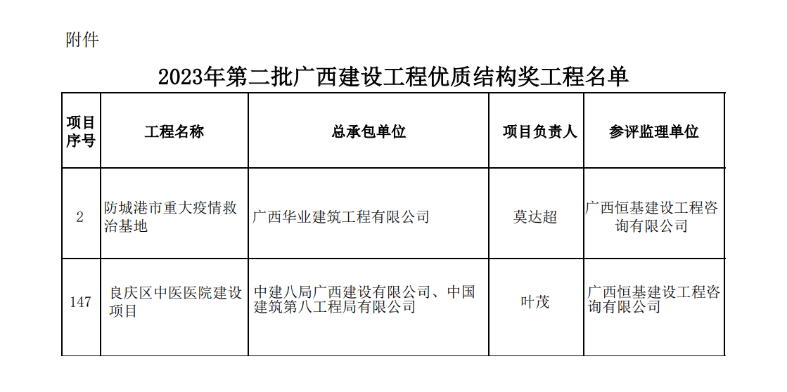 12月25日,廣西建筑業(yè)聯(lián)合會公布了2023年第二批廣西壯族自治區(qū)建設(shè)工程優(yōu)質(zhì)結(jié)構(gòu)獎獲獎名單,由恒基咨詢監(jiān)理的《防城港市重大疫情救治基地》《良慶區(qū)中醫(yī)醫(yī)院建設(shè)項目》位列其中。