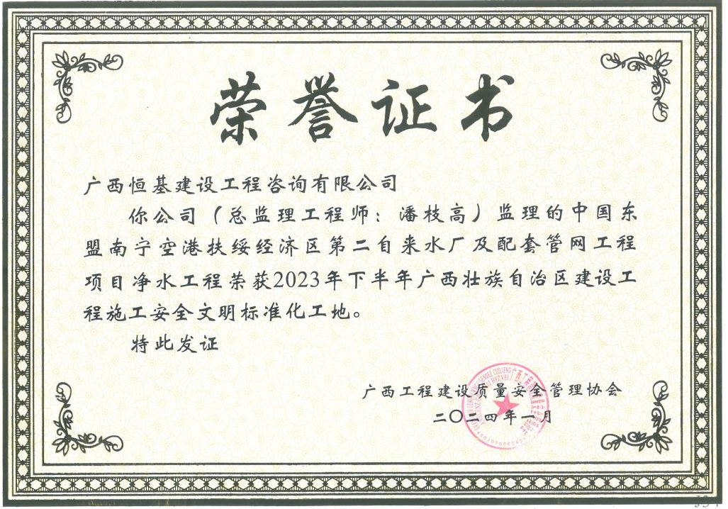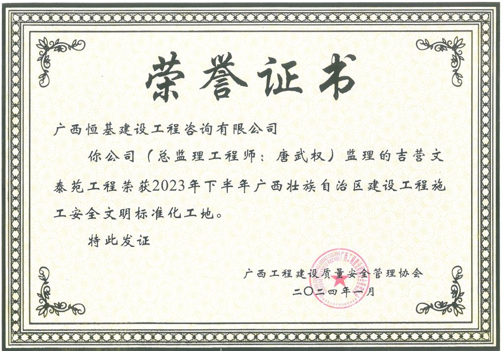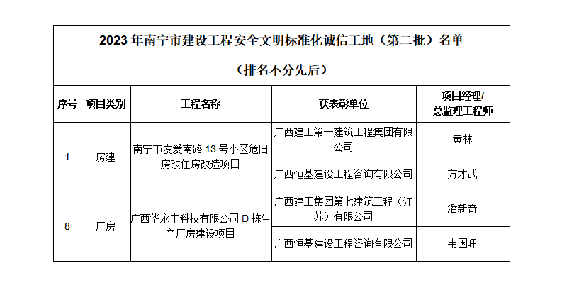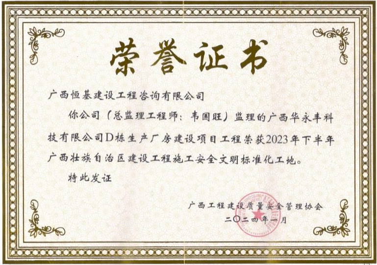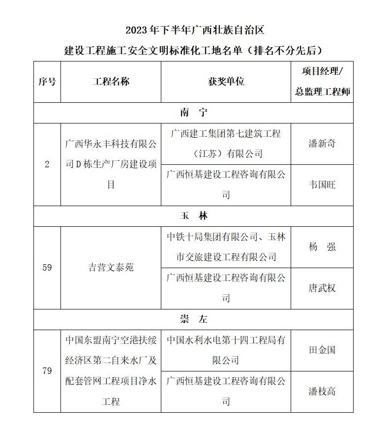 近日,廣西工程建設(shè)質(zhì)量安全管理協(xié)會、南寧市建設(shè)工程質(zhì)量安全協(xié)會分別公布了2023年下半年廣西壯族自治區(qū)建設(shè)工程施工安全文明標(biāo)準(zhǔn)化工地名單、2023年南寧市建設(shè)工程安全文明標(biāo)準(zhǔn)化誠信工地(第二批)名單。恒基咨詢3個(gè)項(xiàng)目榮獲2023年下半年廣西壯族自治區(qū)建設(shè)工程施工安全文明標(biāo)準(zhǔn)化工地,2個(gè)項(xiàng)目榮獲2023年南寧市建設(shè)工程安全文明標(biāo)準(zhǔn)化誠信工地。
