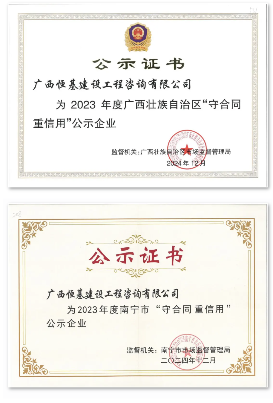 近日,恒基咨詢憑借卓越的市場信譽與優(yōu)質(zhì)的合同履約能力,成功斬獲廣西壯族自治區(qū)市場監(jiān)督管理局與南寧市市場監(jiān)督管理局分別公布的2023年度廣西、南寧市“守合同 重信用”公示企業(yè)這兩級殊榮。