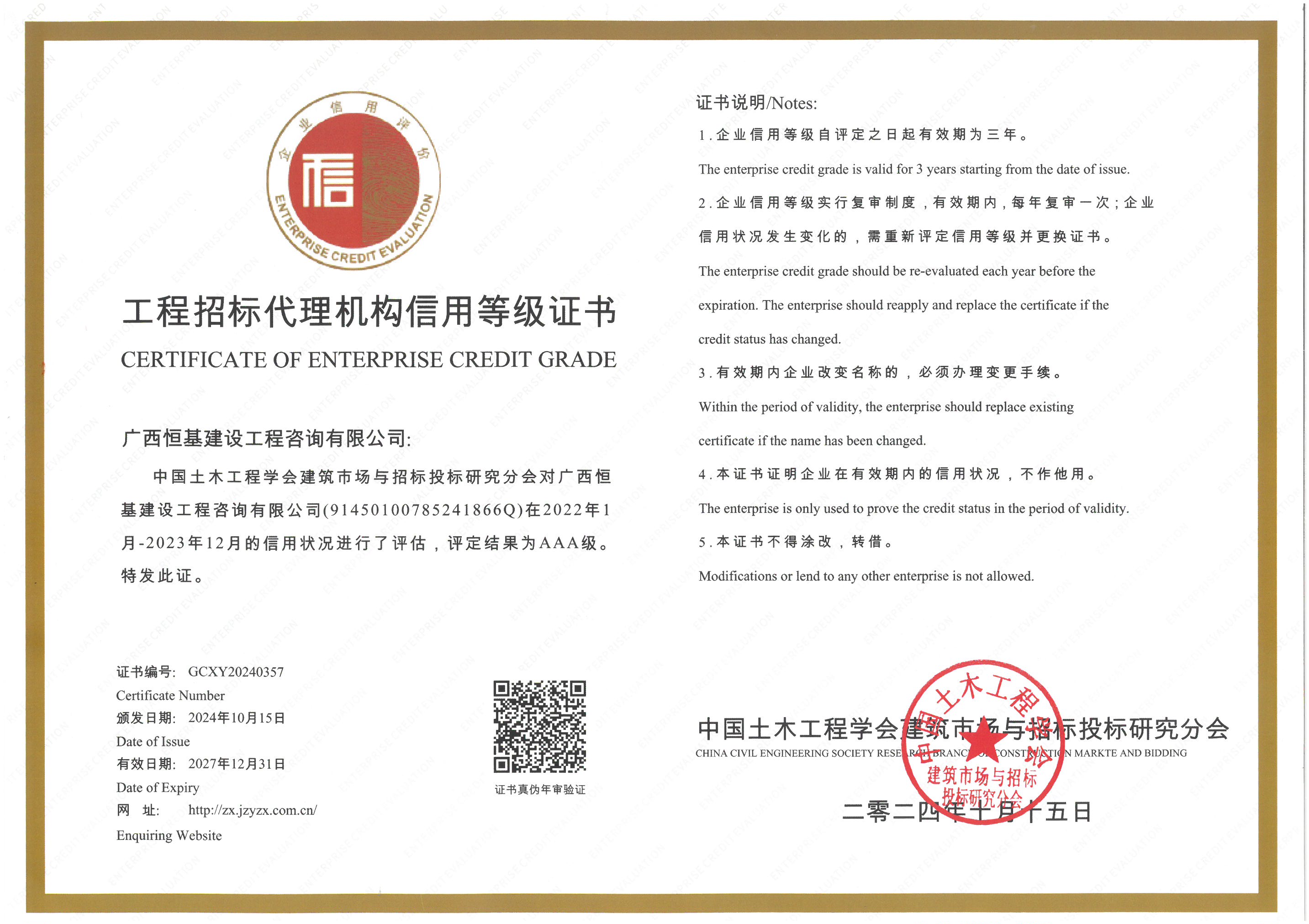 工程招標(biāo)代理機(jī)構(gòu)信用等級(jí)證書AAA級(jí)(有效期至2027.12.31)