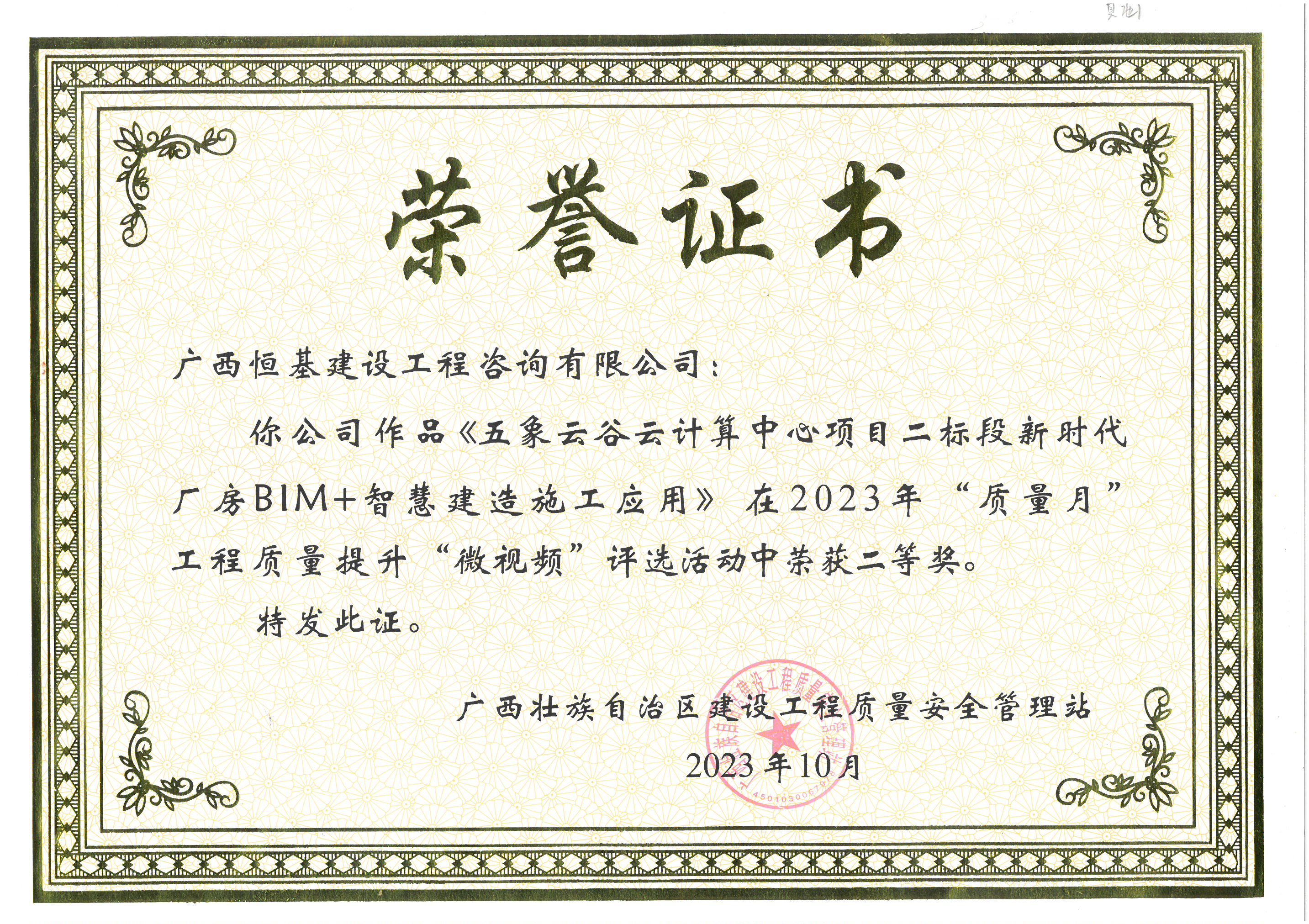 《五象云谷云計算中心項目二標(biāo)段新時代廠房BIM+智慧建造施工應(yīng)用》獲2023年“質(zhì)量月”工程質(zhì)量提升“微視頻”評選活動二等獎